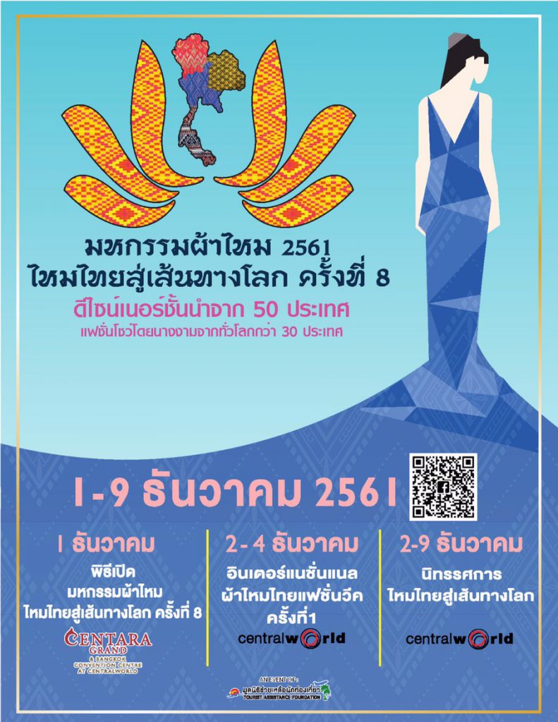 โดยงานมหกรรมผ้าไหม ไหมไทยสู่เส้นทางโลก ครั้งที่8 จะเริ่มตั้งแต่วันที่ 2 -9 ธันวาคม 2561 ณ บริเวณ ชั้น จี ห้างสรรพสินค้าเซ็นทรัลเวิลด์