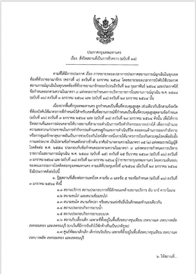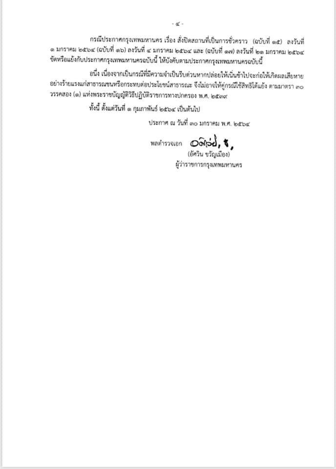 วันที่ 30 ม.ค.2564 พล.ต.อ.อัศวิน ขวัญเมือง ผู้ว่าราชการกรุงเทพมหานคร ลงนามในประกาศกรุงเทพมหานคร เรื่องสั่งปิดสถานที่เป็นการชั่วคราว (ฉบับที่ 18) โดยมีรายละเอียดว่า
