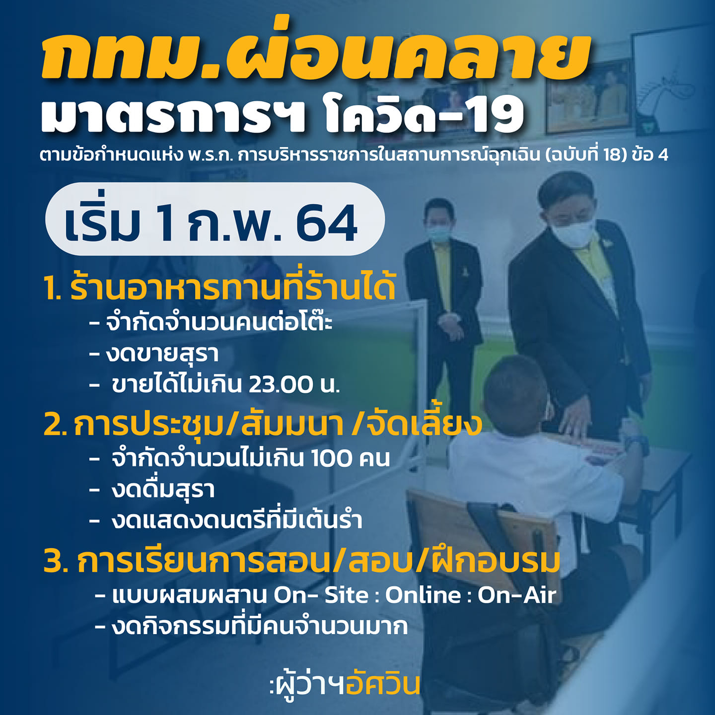 ทั้งนี้ เป็นมาตรการตามข้อกำหนดของ พ.ร.ก. กำหนดการบริหารราชการในสถานการณ์ฉุกเฉิน พ.ศ.2548 (ฉบับที่ 18) ข้อ 4 เพื่อควบคุมการแพร่ระบาดของโรคโควิด-19 ที่ยังมีการติดเชื้อในพื้นที่ กทม. ซึ่งเป็นพื้นที่ควบคุมสูงสุด ขอให้ทุกคนร่วมมือกัน เพื่อควบคุมสถานการณ์ให้กลับมาเหมือนเดิมอีกครั้ง ด้วยการสวมหน้ากากอนามัย ล้างมือ เว้นระยะห่าง และปฏิบัติตามมาตรการอย่างเคร่งครัด สำหรับมาตราผ่อนคลายฉบับเต็มตามประกาศกรุงเทพมหานครเรื่องสั่งปิดสถานที่เป็นการชั่วคราว (ฉบับที่ 18)