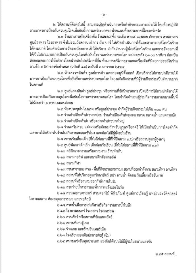 2. ให้สถานที่ดังต่อไปนี้่สามารถเปิดดำเนินการ หรือทำกิจกรรมบางอย่างได้ โดยต้องปฏิบัติตามมาตรการป้องกันควบคุมโรคเพื่อยับยั้งการแพร่ระบาดของโรคโดยเคร่งครัด เริ่ม 1 ก.พ.นี้