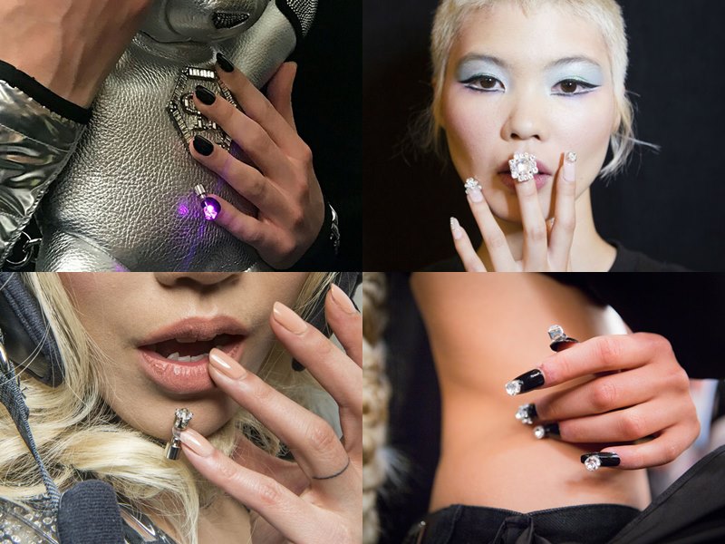 ถ้าเจาะหูแล้วไม่พอก็ขอแนะนำให้เจาะเล็บกันไปเลย สำหรับลุคนี้เป็นการต่อเล็บยาวสุดและทาสีพื้นมันวาวแบบที่เรียกว่า Stiletto Nails เพิ่มความเก๋ด้วยการนำหมุดคริสตัลแบบที่ใช้เจาะหูมาเจาะที่บริเวณปลายเล็บแทน แถมในหมุดยังเป็นไฟ LED อีกด้วย ดูเปรี้ยวและเท่มากทีเดียว