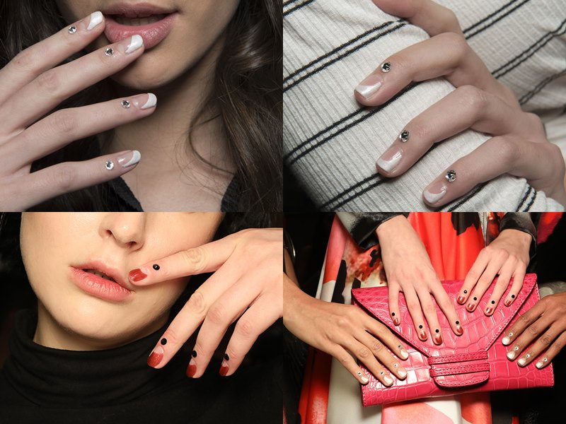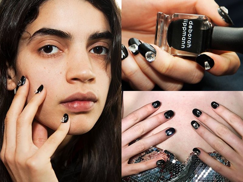 อีกหนึ่งเทรนด์เล็บเก๋ๆ ที่ร่วมกับแบรนด์ยาทาเล็บ Deborah Lippmann คุมโทนด้วยยาทาเล็บแบบเจลสีดำสนิทให้ความมันวาวเหมือนกับกระเบื้อง ก่อนจะติดคริสตัสเม็ดโตที่หน้าเล็บ โดยเลือกเม็ดที่เป็นรูปทรงต่างๆ เช่น วงรี, ข้าวหลามตัด, สี่เหลี่ยมคางหมู เป็นต้น