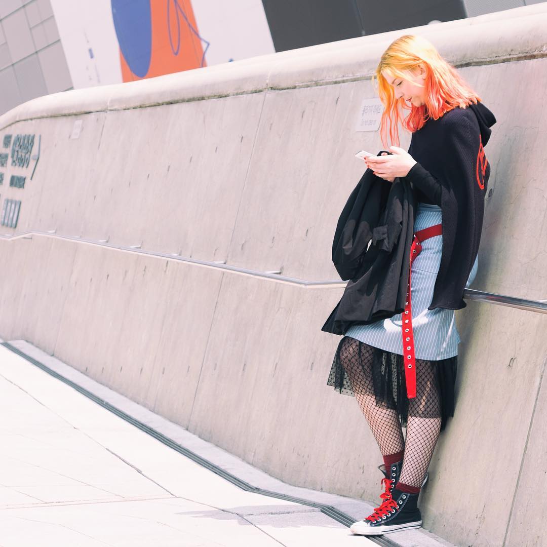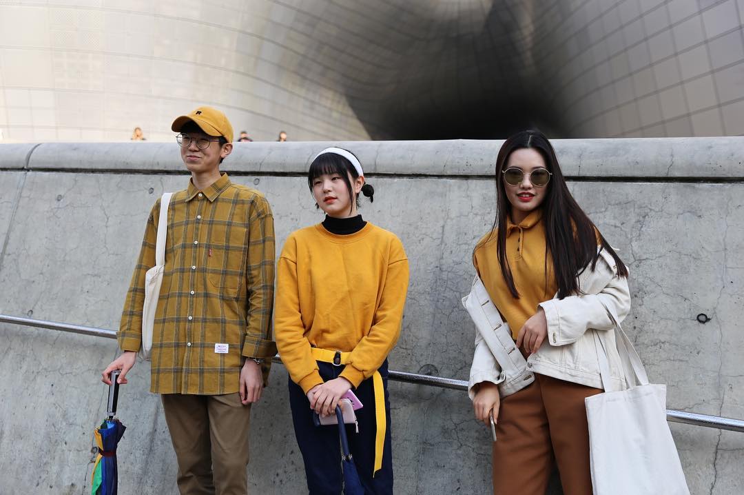 เช่นกันกับฟากฝั่งของแฟชั่นนิสต้าชาวเกาหลีที่มาร่วมงาน อย่างที่คุณผู้อ่าน Hairworld Plus ทราบว่าหนุ่มสาวชาวเกาหลีใต้นั้นเสพแฟชั่น และนำมาปรับใช้ได้อย่างสนุกไม่เป็นรองใคร ในฤดูกาลนี้ Street Style จึงดูสนุกไม่แพ้เมืองแฟชั่นไหนๆ โดยแฟชั่นที่เห็นได้ชัดคือการสลัดคราบสีดำที่คุ้นชิ้น มาสวมใส่ชิ้นงานซึ่งดูสดใสด้วยลายพิมพ์สีสันจัดจ้าน คู่กับแฟชั่นการทำสีผมสนุกๆ ทั้งแบบที่เพียงไฮไลท์, ไล่สีแบบ Ombre Hair ตามแบบนิยมใน พ.ศ.นี้ หรือทำสีทั้งหัวเพื่อให้เข้ากับเครื่องแต่งกายที่สวมใส่มา ก่อนจะปิดท้ายลุคด้วยเข็มขัดไนลอนหรือแคนวาสเส้นยาวแบบหนุ่มสาวยุค 90’s และรองเท้า Sneakers รุ่นล่า เพื่อเติมเต็มลุคสนุกๆ ให้สมบูรณ์